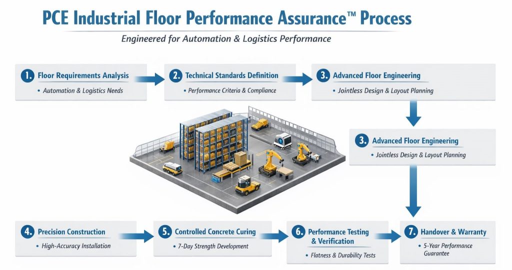 PCE Industrial Floor Performance Assurance™ is a high-performance industrial flooring program specifically developed for automated warehouses, logistics centers, and mission-critical industrial operations where floor precision, durability, and reliability directly impact productivity and system uptime.